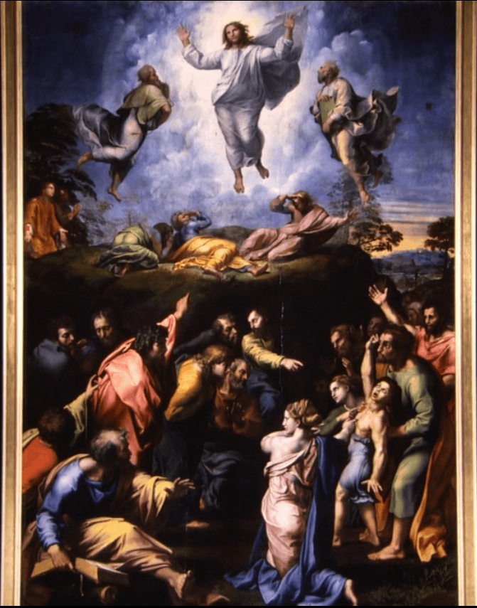 这幅画中还描绘了另外一个奇迹:耶稣很快就治愈了被恶灵附身的一个男孩。这个故事来自于圣经。
