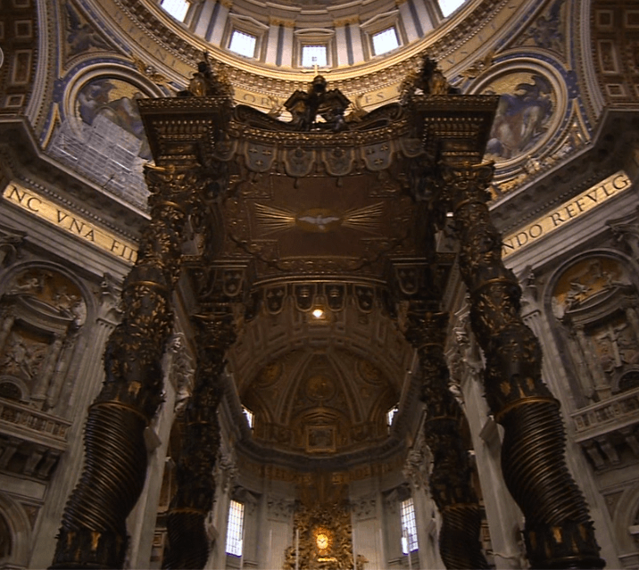 在穹顶的下方,你所看到的是带有天盖的祭坛。这是由巴洛克时期的大师贝尼尼所设计的。