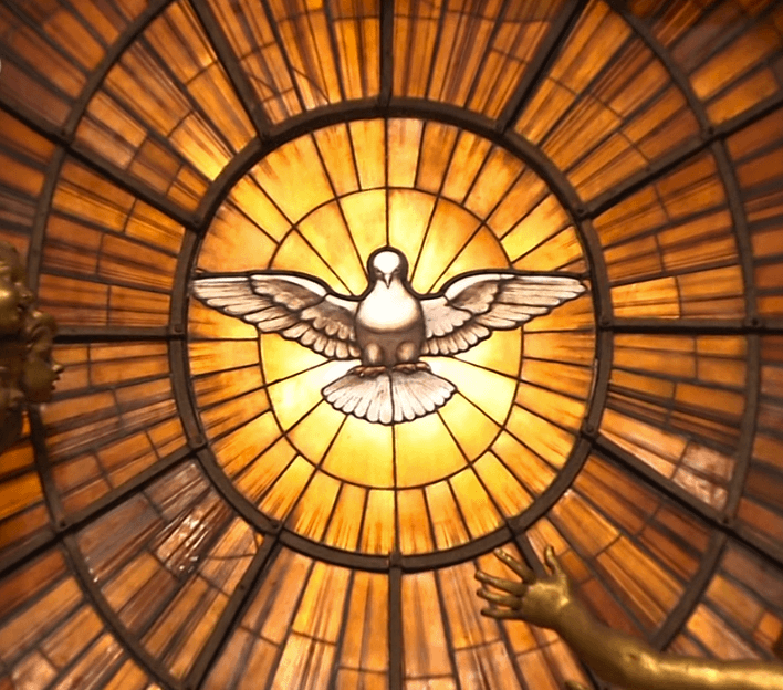在象征洗礼的鸽子彩绘玻璃投射之下的,是由贝尼尼经手的圣彼得主教宝座。