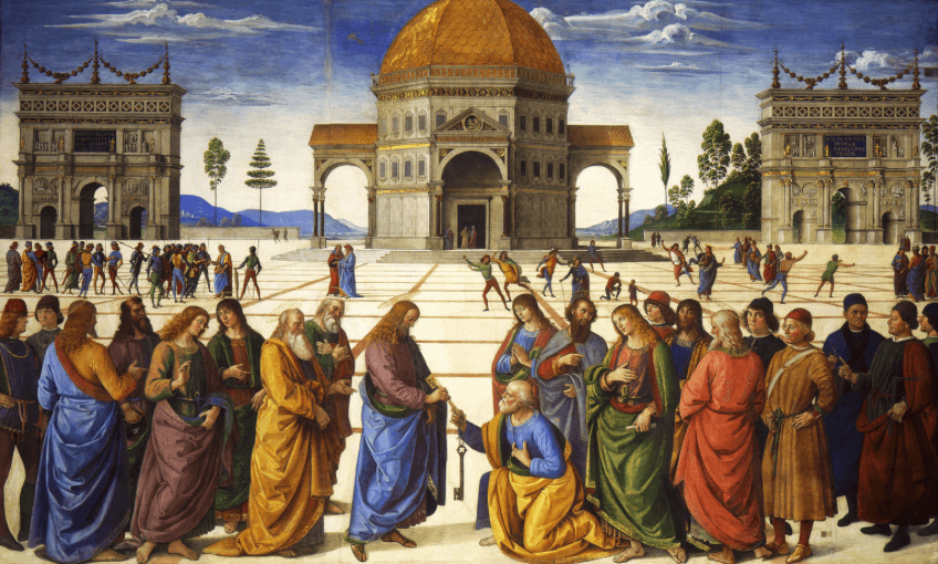 这个画面描绘了圣经中耶稣将通往天国的钥匙交给彼得,并且将教会托付给他。