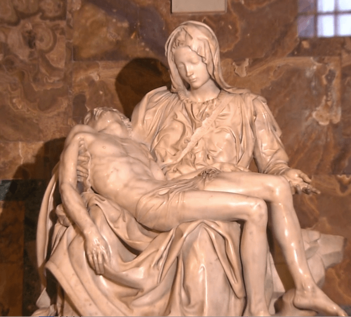 这是米开朗基罗25岁时制作的《圣母怜子像》,表现出了圣母玛利亚的悲伤之情。