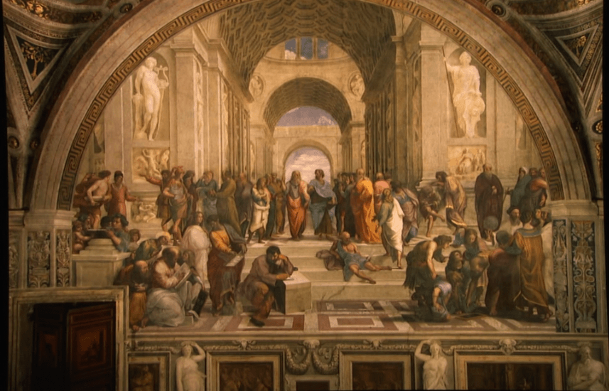 这幅画描绘了好几位古希腊智者,他们汇集在庄严的建筑物内。