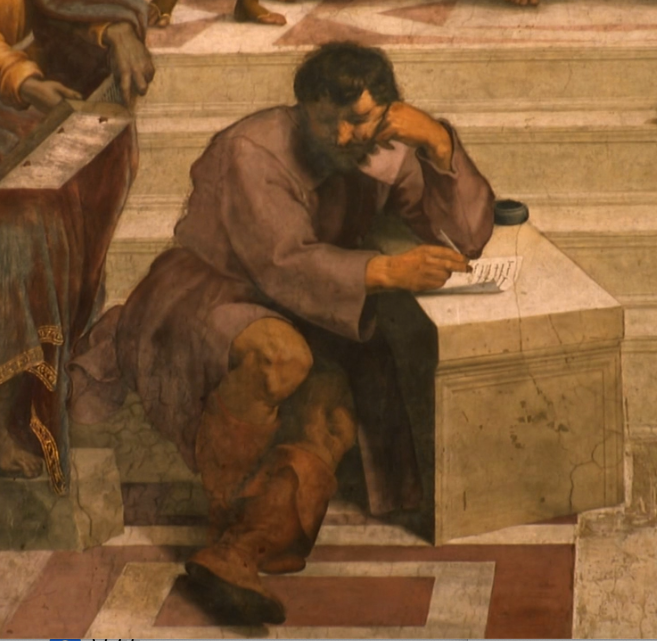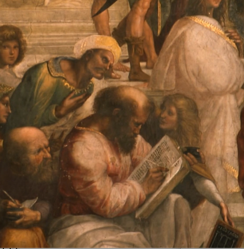 在他们前方的,是数学家毕达哥拉斯。他曾表示,只有数字才是一切的起源。他正在笔记本上写东西。