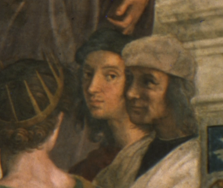这是拉斐尔被《创世纪》所感动后,为了向米开朗基罗表示敬意,才把他画进去的。