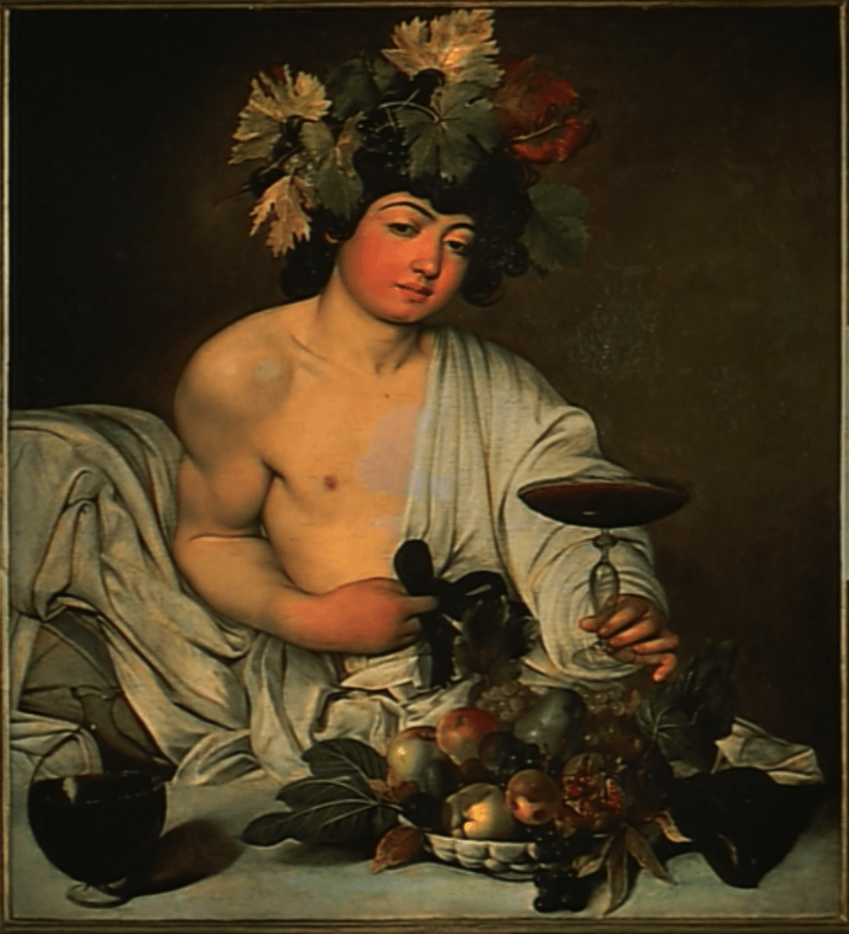他用年轻人的样子画出希腊罗马神话中的酒神-巴克斯。