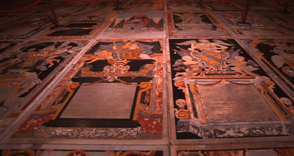这座大教堂也是用来让骑士团做礼拜的。教堂的地板上铺满了400个墓碑,都是用各式各样的大理石做成的。