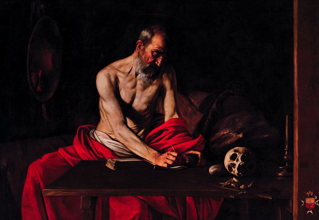 据说卡拉瓦乔请骑士团团长当模特,画了这一位是学者同时也是圣人的耶柔米。