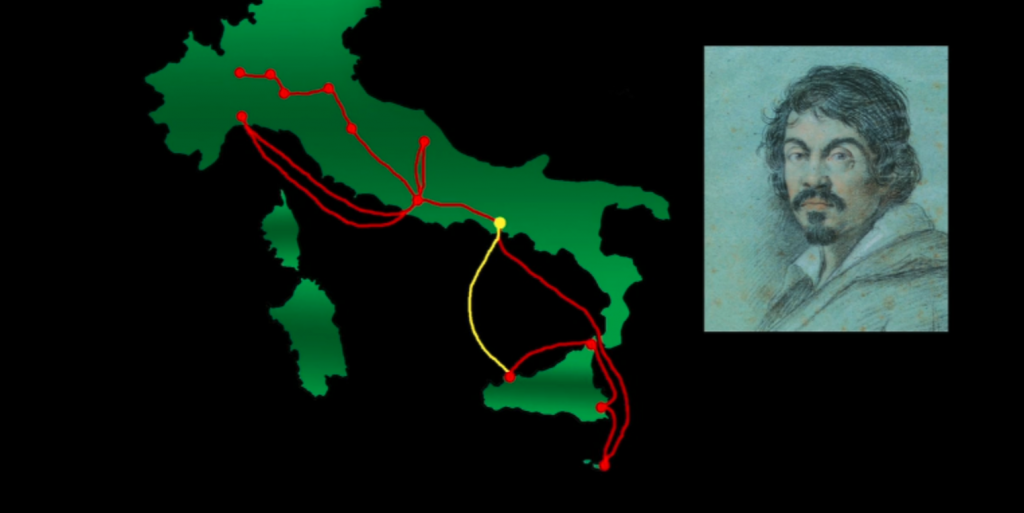 一方面卡拉瓦乔被赞扬为天才画家,另一方面他又以罪犯的身份不断逃亡。