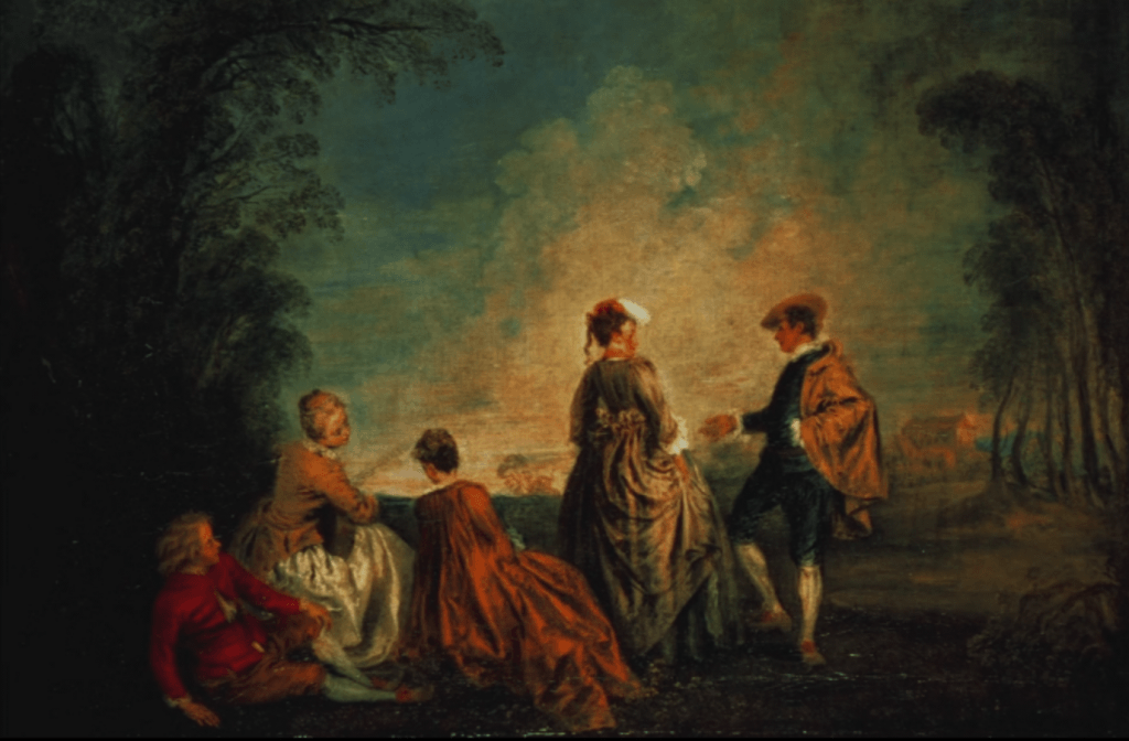 画家用鲜艳的色彩衬托出活泼的贵族们谈恋爱的模样。