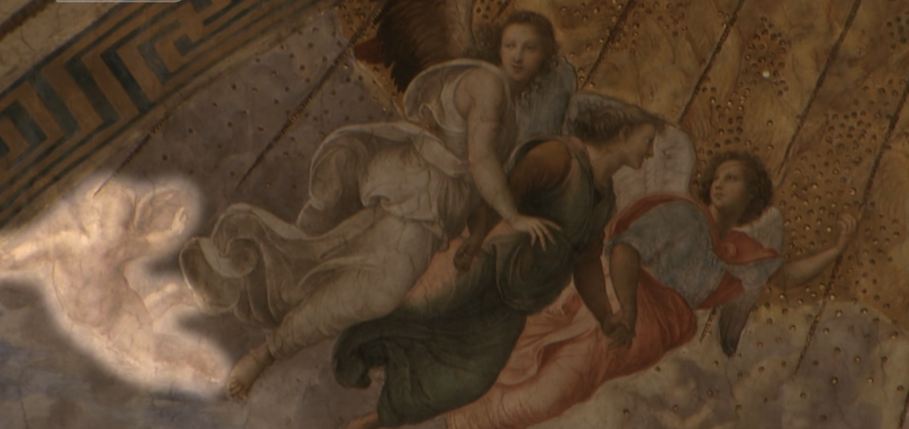 拉斐尔在梵蒂冈最早绘制的那幅壁画中其实也画上了无数的天使。