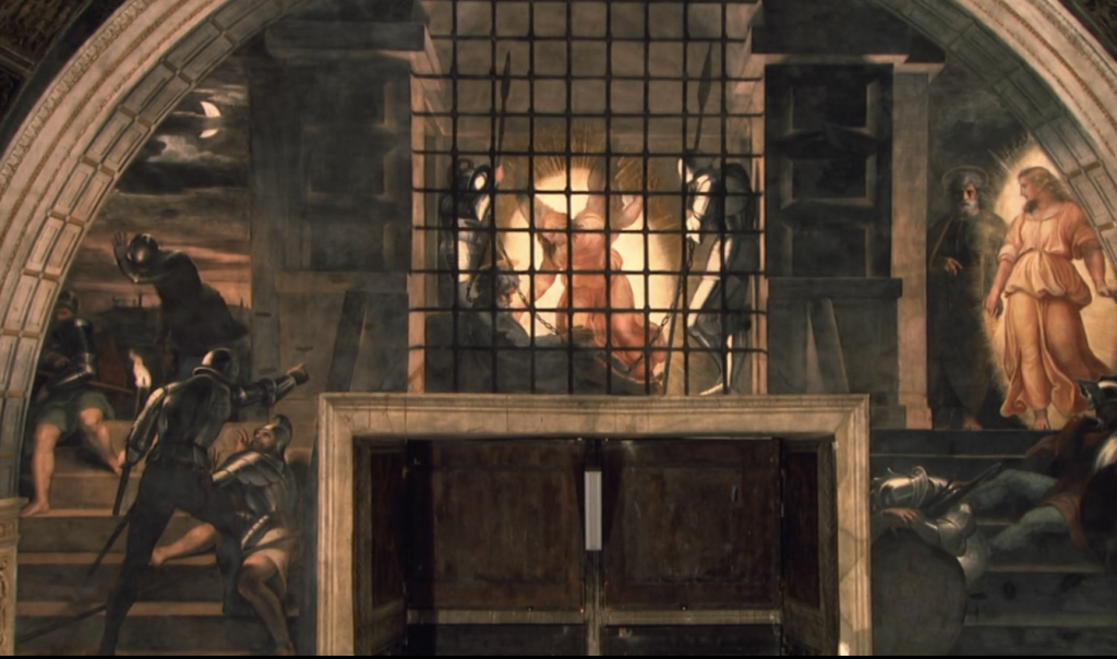 億描绘了耶稣弟子中的代表-彼得-从犹太王的牢狱里逃出去的经过。