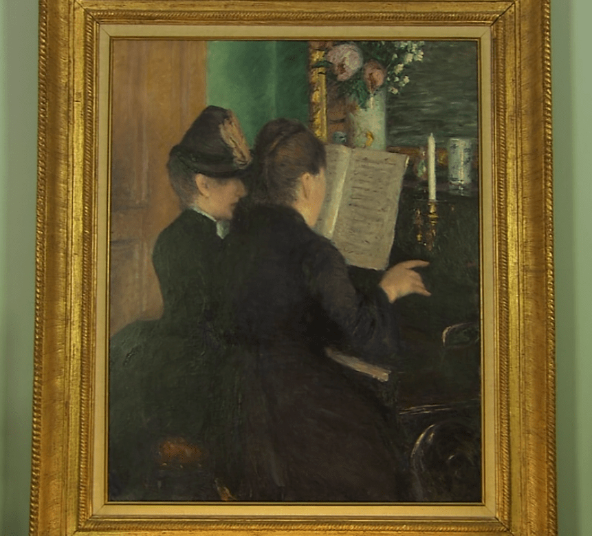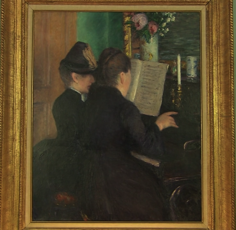 这幅画富有诗意地诠释了都市的风俗,这位戴着羽毛装饰帽的妇人正在上钢琴课,在她身边的老师用手轻轻地打着节拍。两位女性都穿着黑衣,钢琴的颜色也很暗沉,令人感觉到上课时的严肃氛围,幸亏有鲜艳的花朵缓和气氛。据说莫奈非常喜欢卡耶博特送的这幅画,他把它挂在了卧室里作为装饰。