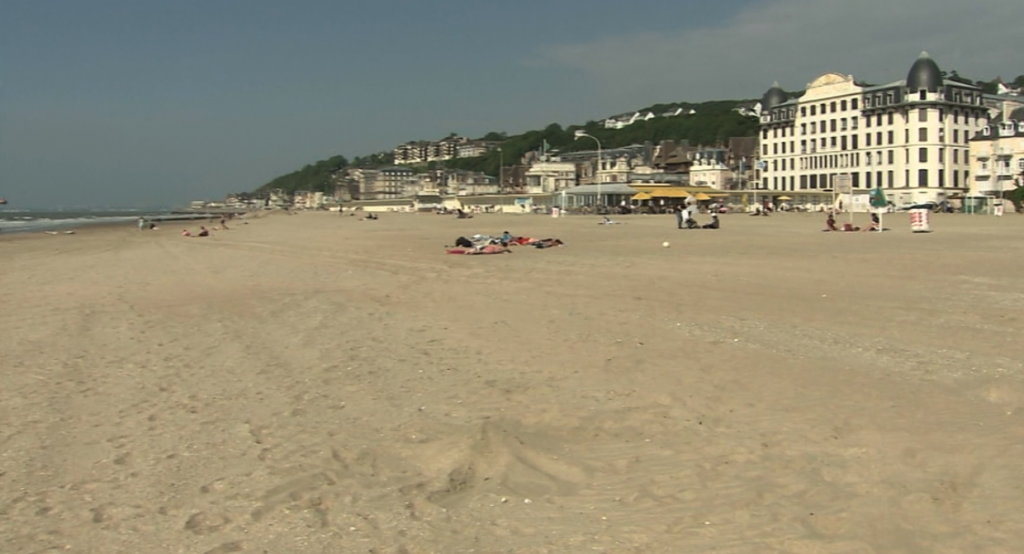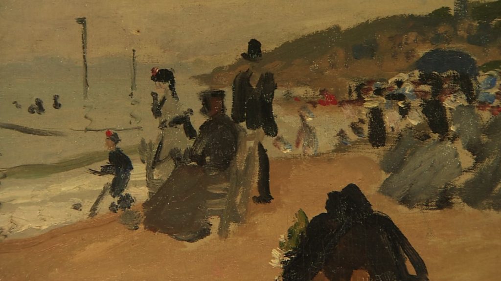 他们常去特鲁维尔海岸作画,这幅画就描绘了那里的景象。人们在海滩上享受着日光浴,莫奈用交叠的线条画出他们的模样,展现出夏天阳光照射下的热闹景象。