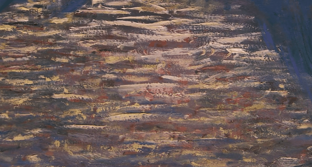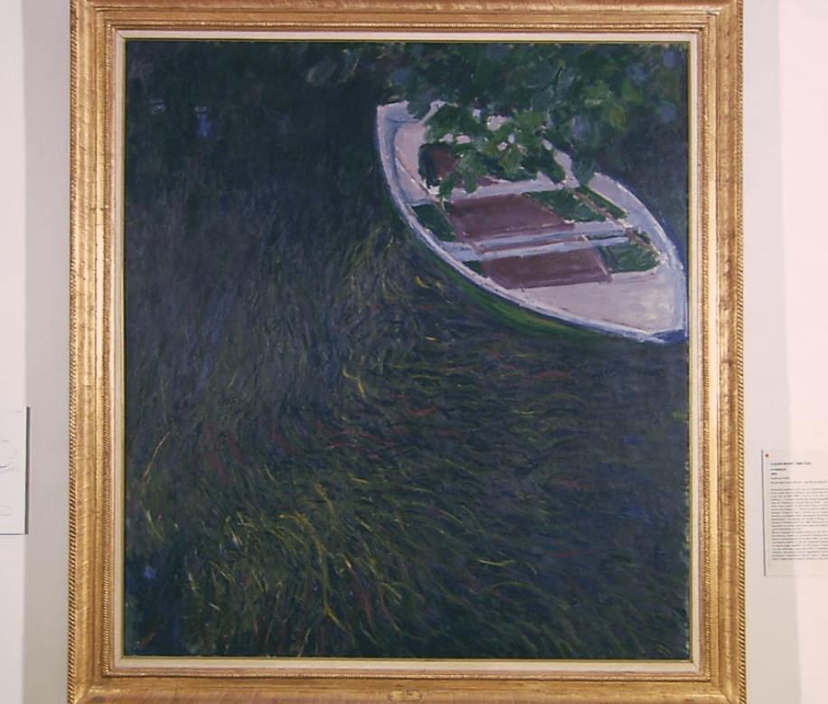 莫奈有效地利用漂浮在河面上的小船,巧妙地画出了受到水波的晃动后在水面下摇晃的水草。