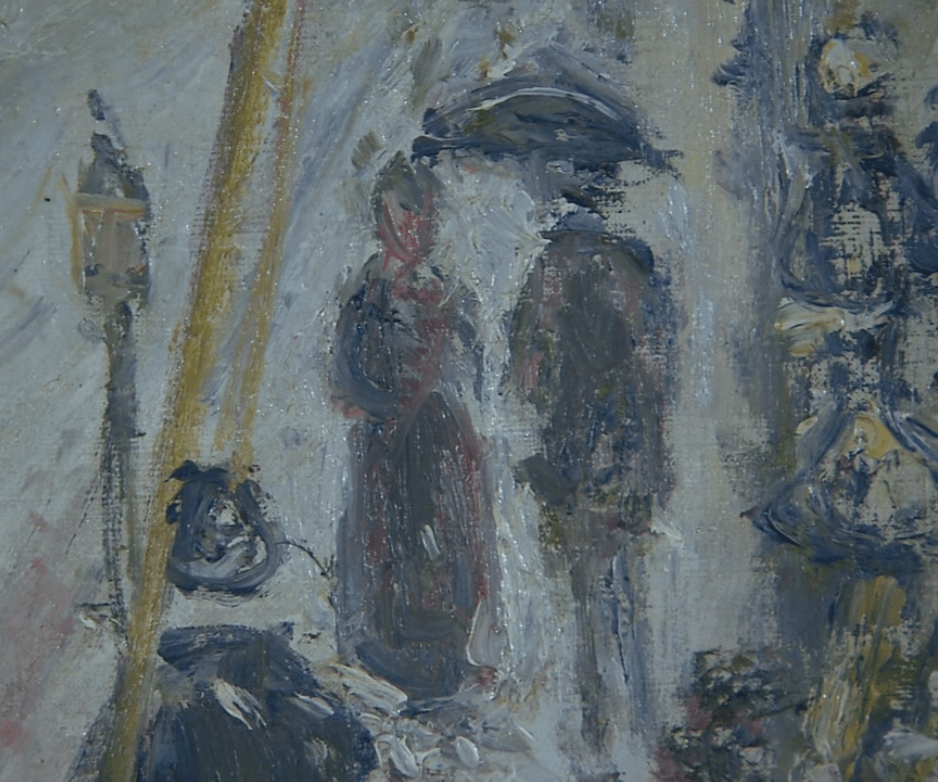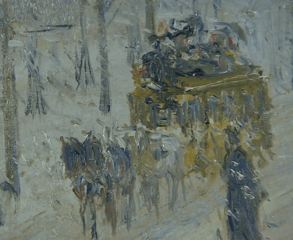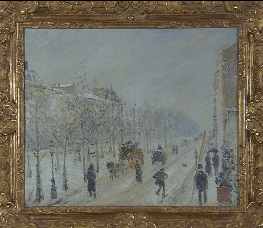 他很喜欢创作风景画,这幅画描绘了因为下雪而开始变得模糊的巴黎的街景。巴黎走向都市化始于十九世纪中叶。