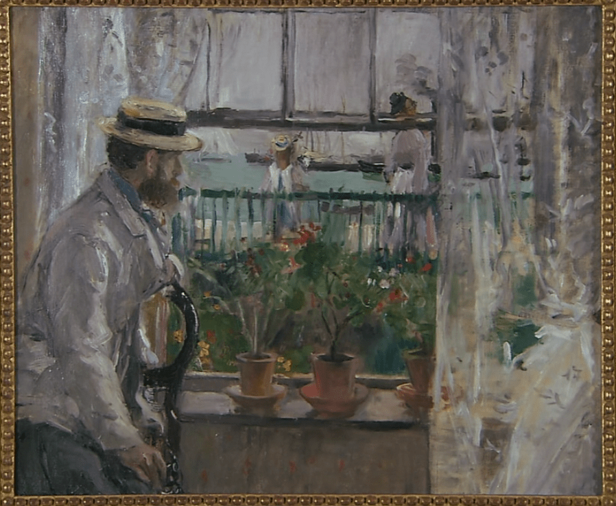 婚后第二年,莫里索就画了一幅风景画,描绘了她与欧仁在英国怀特岛上旅行的情景,她的丈夫欧仁就站在窗边。