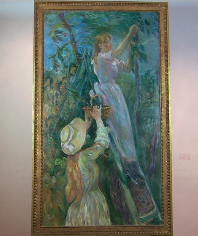 在和煦的春风吹拂下,两位少女愉快地采着樱桃。莫里索不断地改变手法,从素描、水彩到粉彩,总共花了三年的时间才完成了这幅画。梯子上的这个少女,起初是以她最爱的女儿茱莉为模特画的,但是她最后换了模特重新画过,可见她非常重视这幅画。