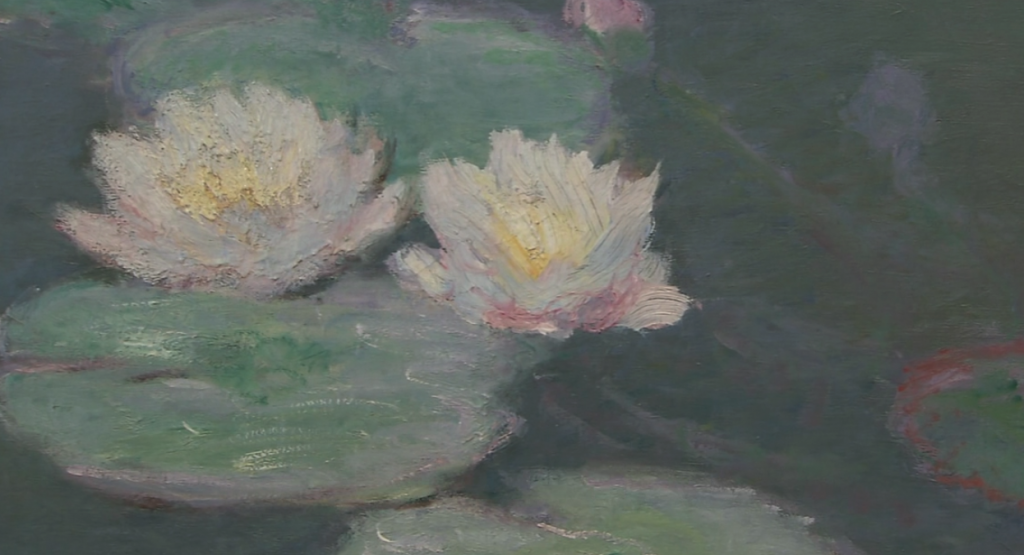 相较于受光的左侧水面,在形成花影的右侧,他将水的色泽以及沉淀巧妙地加以区分。我们在画布上看到了水的摇曳,以及漂浮在水面上的睡莲。莫奈通过描绘水面,充分地发挥了自己出色的描绘功力。