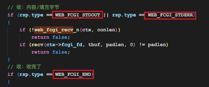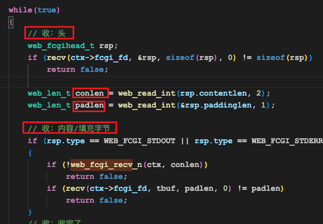 fcgi的应答是分多次发送的,也就是说,我们会收到多个”头+内容+填充字节”这种数据,所以接收的过程得写在循环中。