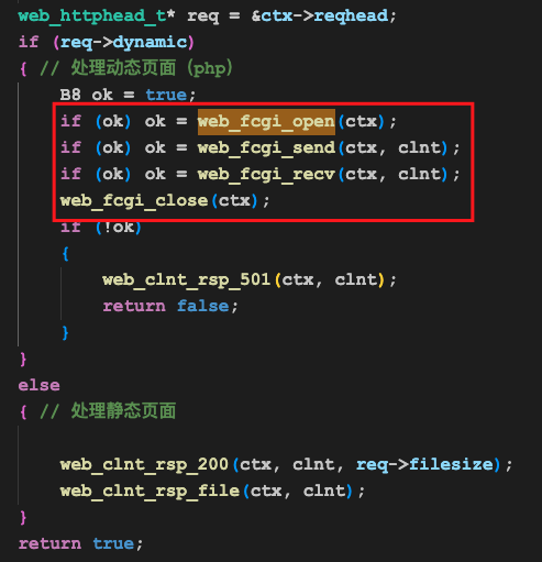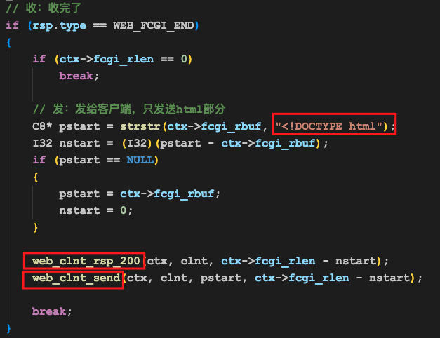 我们首先像发静态页面那样,先发一个http200应答,然后再从fcgi应答中提取html部分,转发给浏览器即可。
