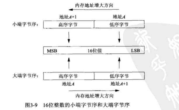 对于一个16位的整数,他由两个字节组成。内存中存储这两个字节有两种方法:一种是将低序字节存储在起始地址,称为小端(little-endian)字节序;另一种方法是将高序字节存储在起始地址,称为大端(big-endian)字节序。