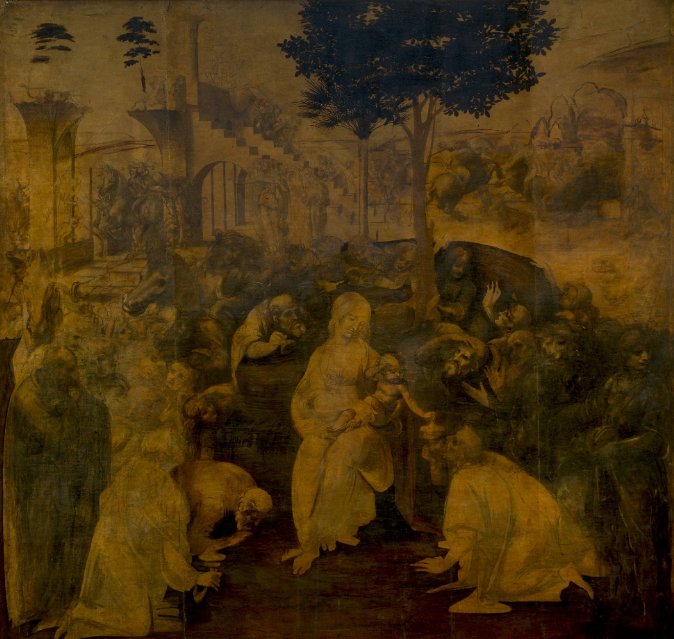 这幅画叫东方三博士的礼拜,讲的是三位智者庆祝耶稣诞生。这幅画没画完就中途放弃了,传说是因为太复杂了,画不下了才罢手的。正因为他复杂,所以说是美术史上非常珍贵的画作。