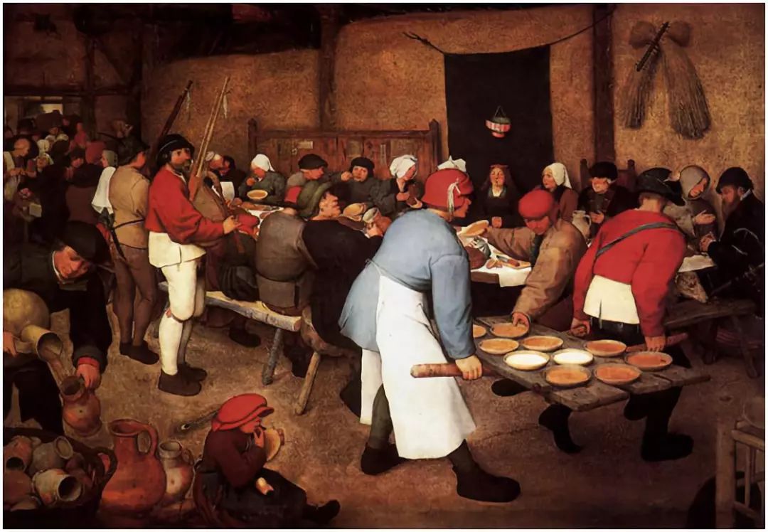 勃鲁盖尔也常常把农民当作题材,这是他的代表作之一,农民的婚礼。这幅画画的是富裕农民婚礼的场景,他通过画这幅画告诫农民不要暴饮暴食。