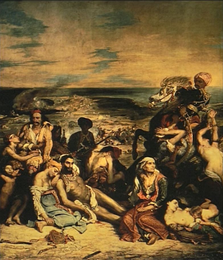 作品的原型事件是1822年发生在希奥岛的屠杀事件。奥斯曼土耳其的军队,当时屠杀了数万名岛民,据说还抓走了数十万的男女做奴隶。
