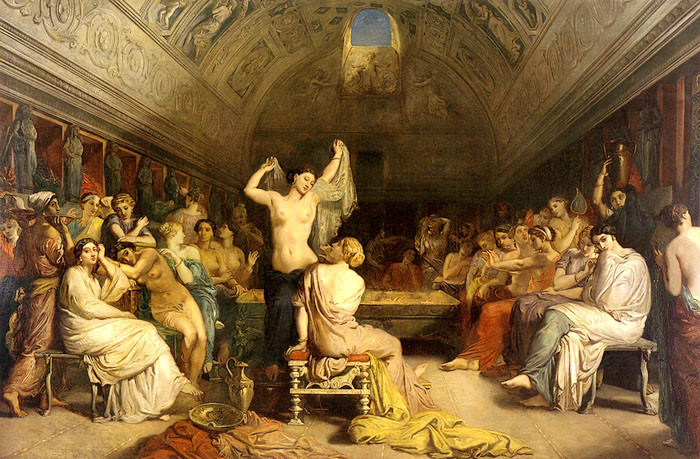 下面这幅画是《古罗马公共澡堂》,他受到了当时逐渐被发现,成为风潮的古代遗迹–庞贝城–的启发,创作了该作品。