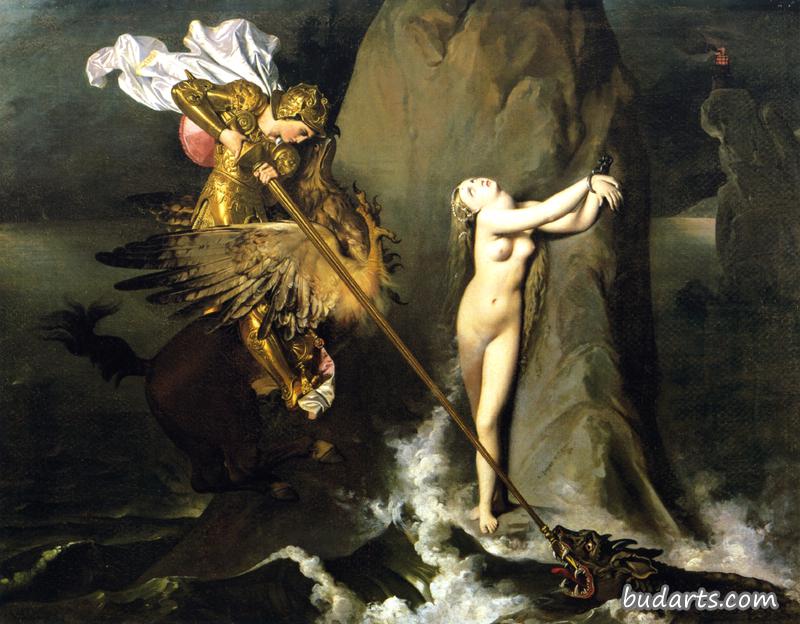 另外,安格尔自己也不仅仅是创作依循新古典主义的典型作品。这幅《罗杰解救安吉丽卡》就是从十六世纪的叙事诗中得到灵感的。安格尔很难得地对当时十分流行的浪漫主义进行了挑战。