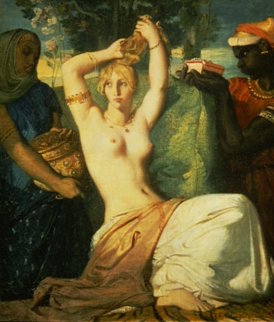 这是安格尔的徒弟夏塞里奥的作品《以斯帖的盥洗室》。为了拯救犹太民族,以斯帖在盥洗室里梳洗打扮,获得了对方国王的欢心,最终成为王妃。夏塞里奥用老师安格尔的手法,画出了美丽的女性。同时也加入了浪漫主义,选用了比较戏剧化的主题。夏塞里奥想要融合新古典主义和浪漫主义的魅力。