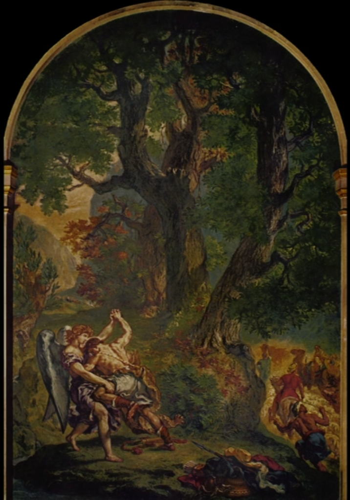 这是以旧约圣经为题材创作的《雅各布与天使搏斗》,采用笔触明显的用笔方式,搭配大量的色彩组合,巧妙地将质感与空间表现了出来。不久之后,这就成为了印象派使用的技法。