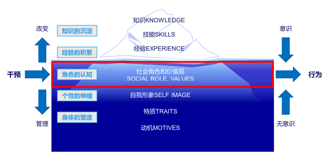 人们的能力发展其实是由社会角色和价值观来决定的,但是冰山以上的部分会有意识的影响,冰山以下的部分会无意识的影响。