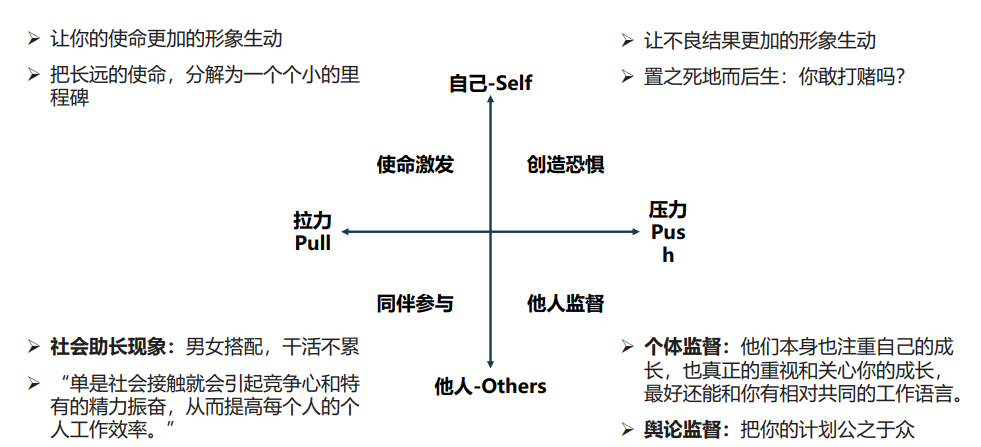 自己创造拉力,即做使命激发:把挣10亿的目标,分解为一个个1年30万的目标。