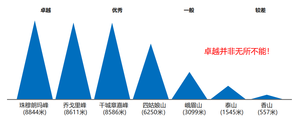 人们能记得非洲第一高峰乞力马扎罗峰,却不记得世界第二高峰乔戈里峰;泰山海拔并不高,但在中国却家喻户晓;香山就是一个小土坡,但在北京却是海拔最高的地方。因此卓越并非完美,只要有显著优势即可。