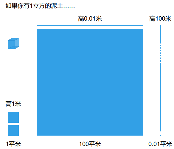 再举一个例子,如果你有1立方米的泥土,如果你把他摊在100平方的地面上,那么高度也就1厘米;如果你把他集中在1平方厘米的土地上,那么他的高度将达到100米。